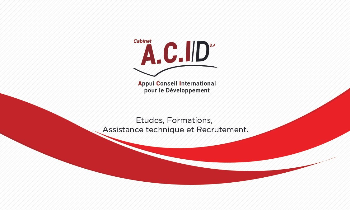 Appui Conseil International pour le Développement (A.C.I/D-SA) est un Cabinet d’études et de conseil fondé par une équipe d’économistes et d’experts expérimentés issus d’entreprises privées, de la haute administration, du secteur financier et des universités. Le Cabinet A.C.I/D-SA regroupe une quinzaine de professionnels permanents et s’appuie sur un réseau de consultants indépendants avec lesquels il a développé des liens à long terme. Les principaux partenaires du Cabinet sont les institutions publiques nationales, les institutions et les agences internationales, les organismes bilatéraux et multilatéraux de coopération de développement ainsi que les entreprises et institutions privées.